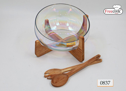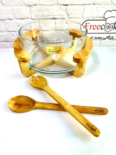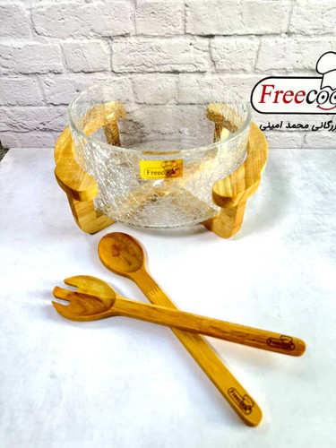 کاسه سالاد با پایه چوبی از جنس رابر و بلور بسیار با کیفیت و به همراه قاشق چنگال چوبی